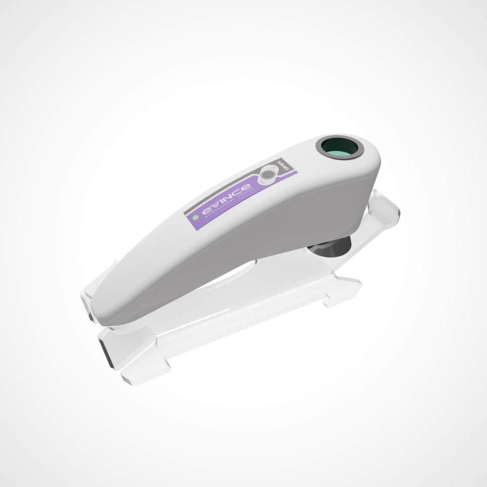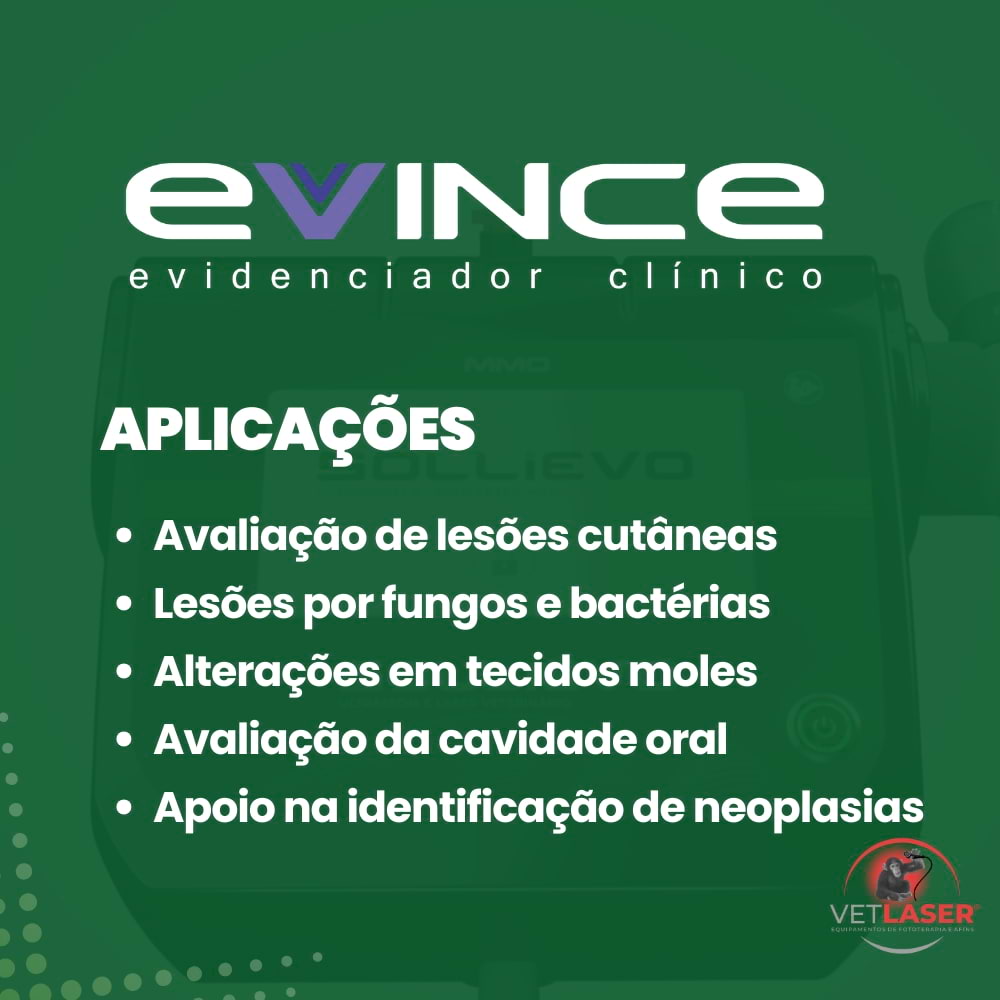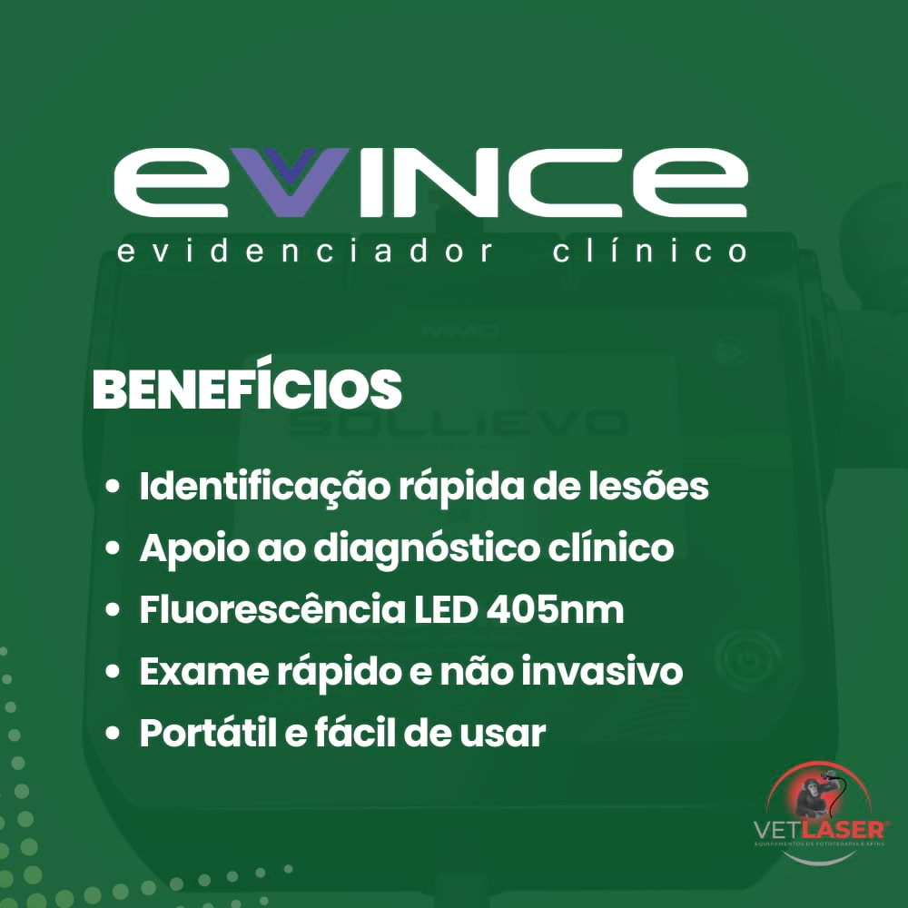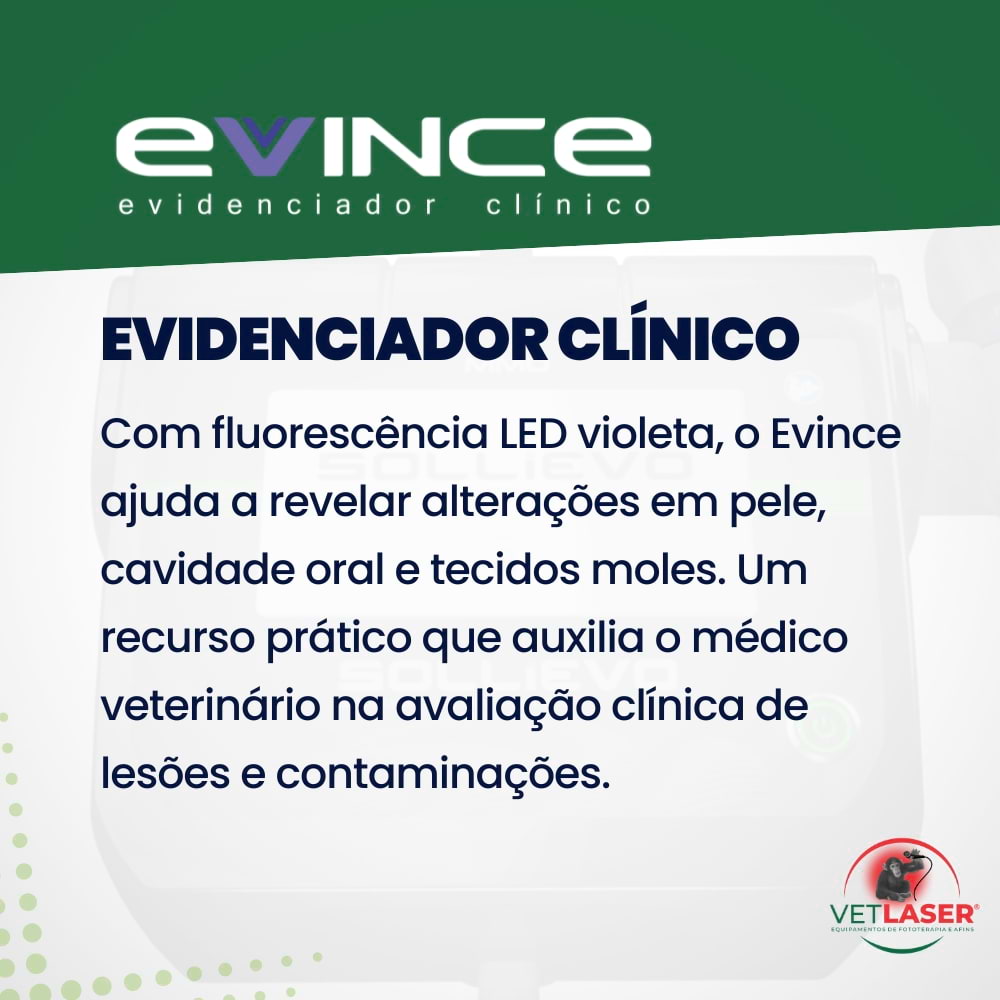 O Evince é um equipamento auxiliar para diagnóstico clínico veterinário que utiliza fluorescência óptica com LED violeta (405nm) para evidenciar alterações em tecidos, microrganismos e lesões que podem não ser visíveis na inspeção convencional.